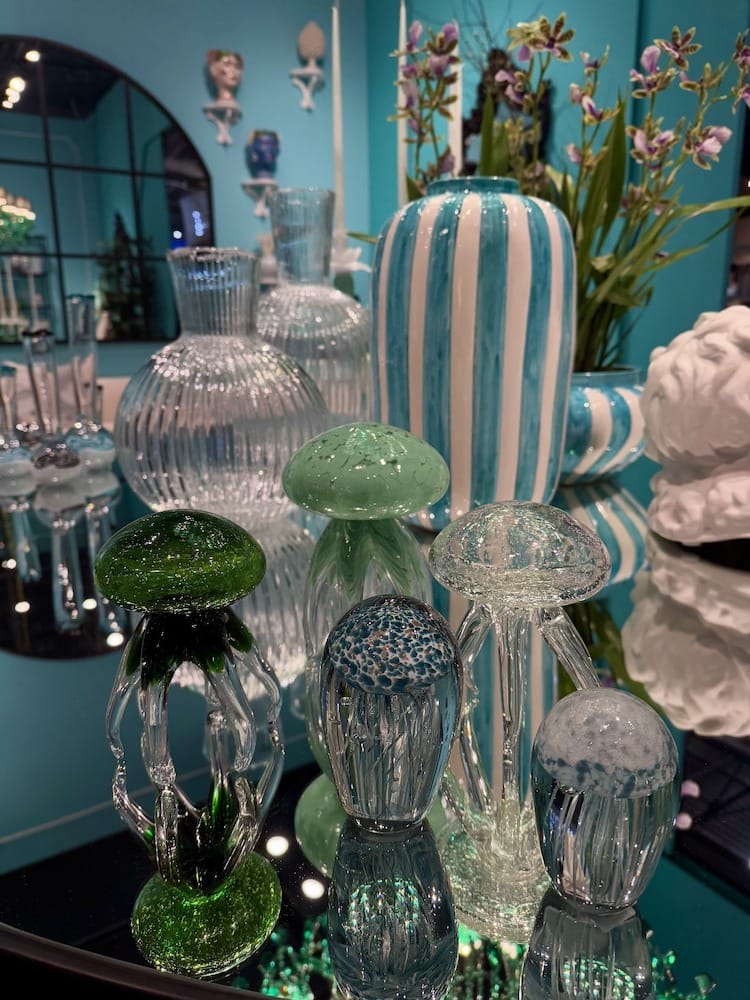 A handcrafted glass ornament with different color inlays.A stunning accent for shelves, tables, or display cabinets, it brings an artistic splash of the sea into any space.