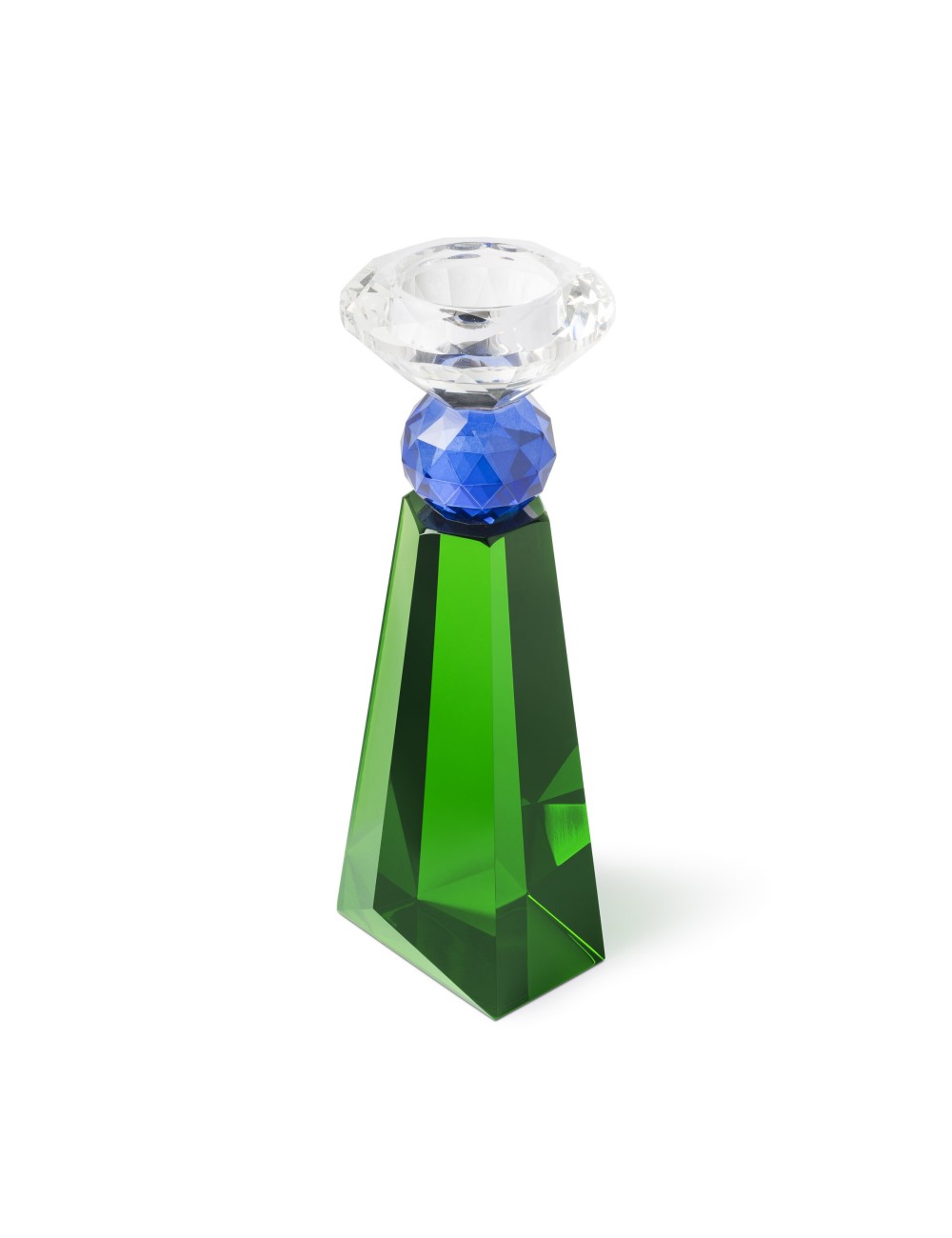 A colorful optic crystal glass candleholder is a vibrant, eye-catching piece made from textured glass in various hues. When lit, the candle’s flame creates beautiful reflections and glows, adding warmth and elegance to any space.