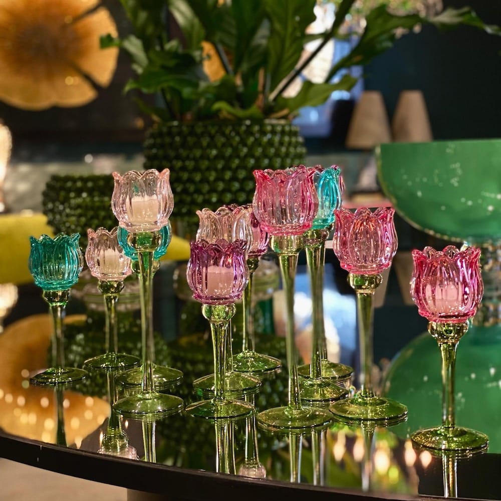 A joyful mix of handmade candleholders in bold, eye-catching hues.