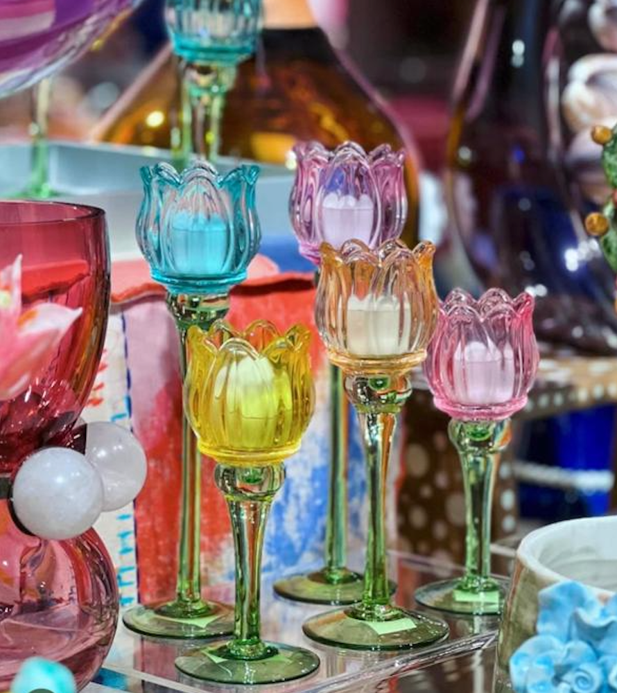 A joyful mix of handmade candleholders in bold, eye-catching hues.