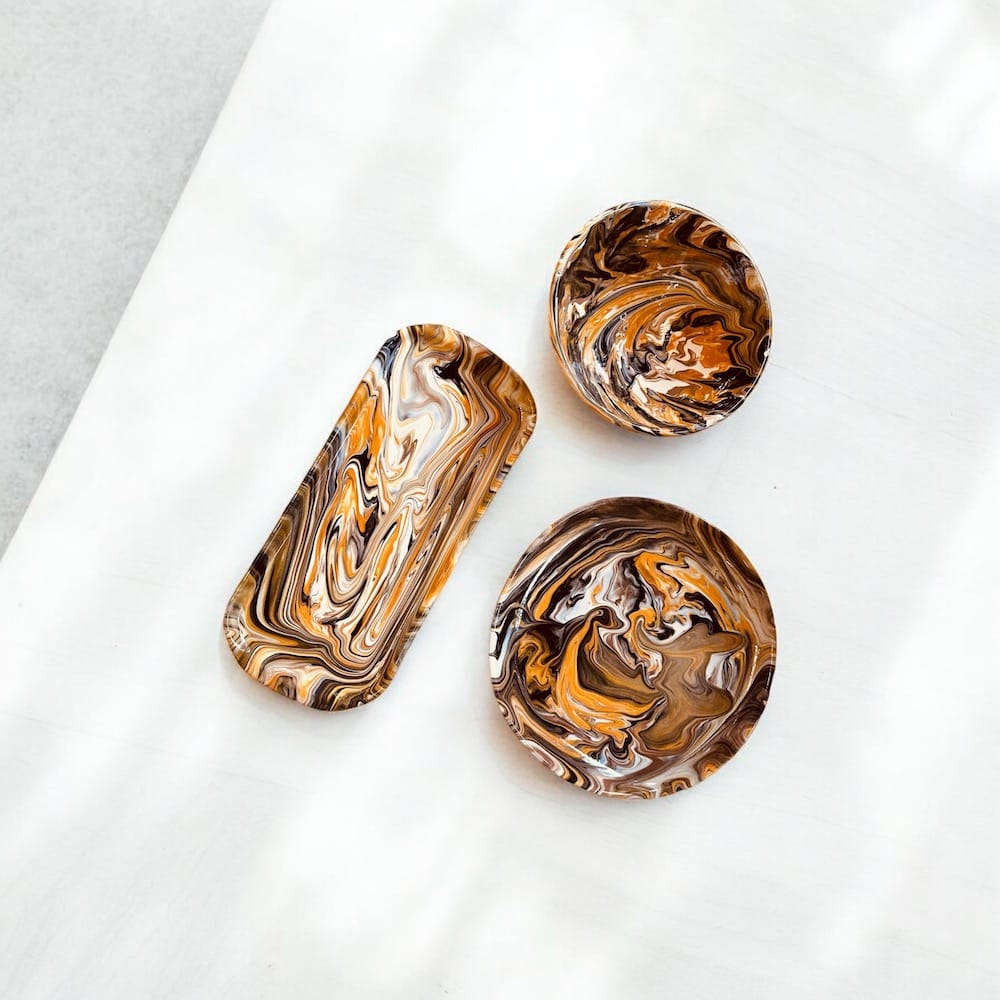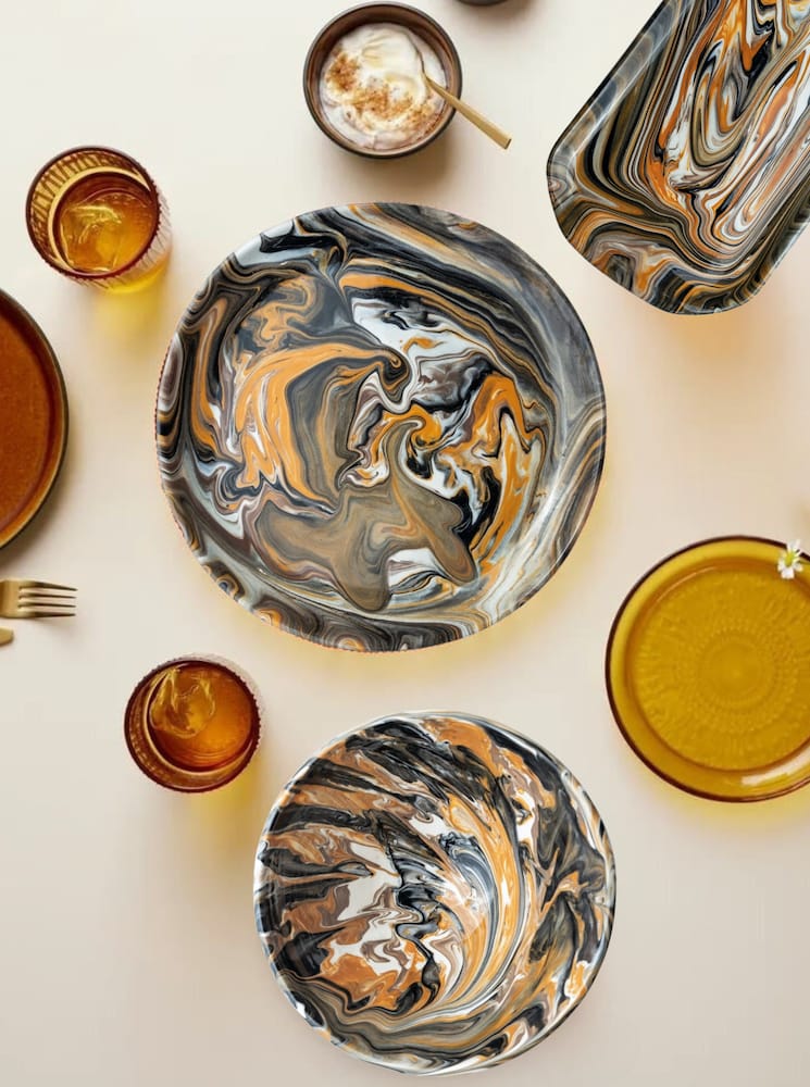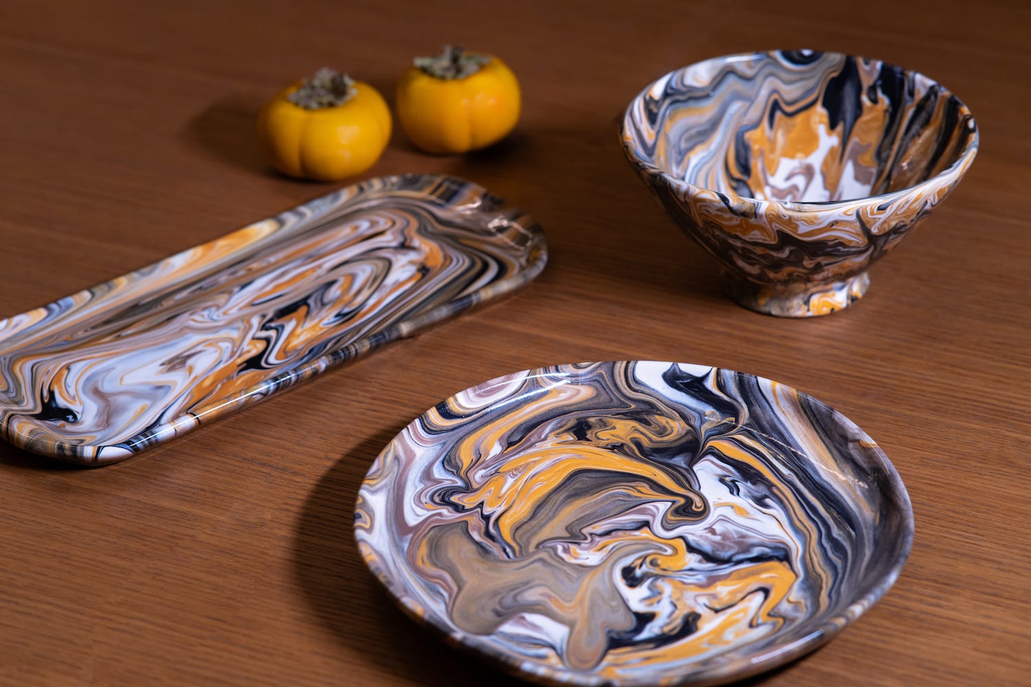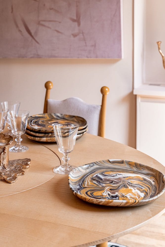 The Abstracto plates are handmade & designed in France. Its beauty is its round shape with imperfect edges. The harmonious disorder and confusion of natural ochre and black pigments to create a timeless chic with a vintage look.