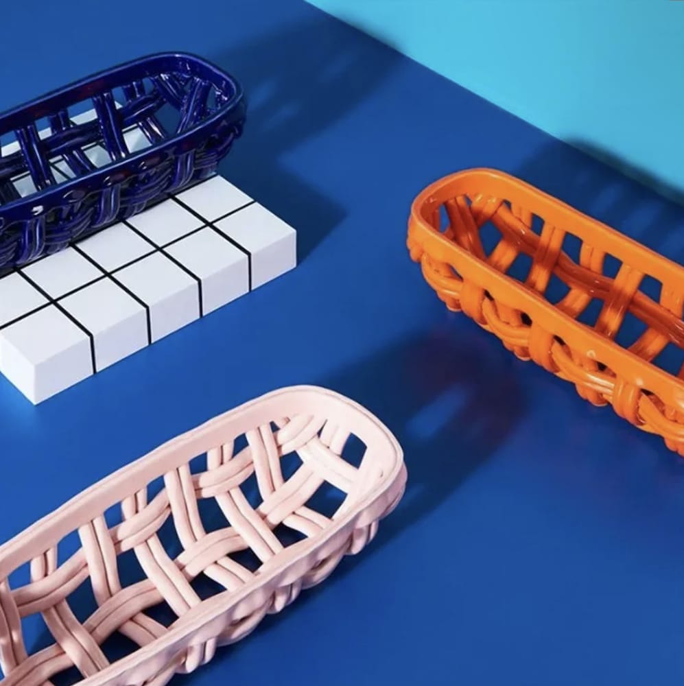 Basket for fruit or bread. Made from braided strips of stoneware and lacquered in a beautiful dusty pink shade.