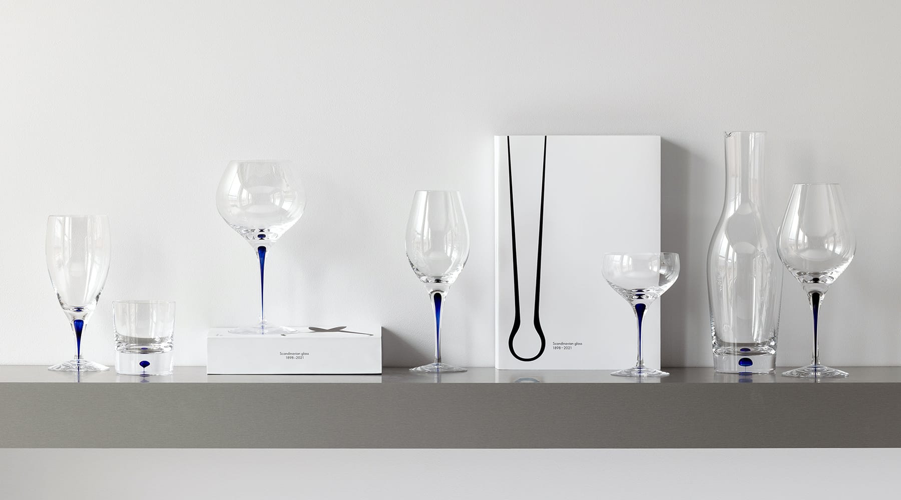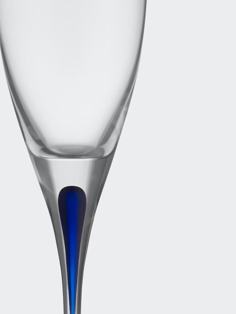 Intermezzo Champagne holds 260ml and is suitable for sparkling drinks. The tall, slim bowl of the glass helps preserve the bubbles in the drink. The glass is mouth-blown in Sweden by expert glassblowers with a drop of blue sealed inside the stem – an innovation based on traditional craftsmanship. The series was introduced in 1984.