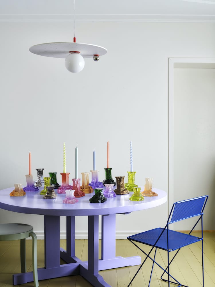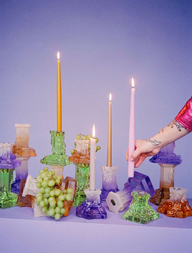 The Rocky Baroque series is an equally rebellious and playful remix of the classic column. Monumental lines collide with pop colors and raw, angular surfaces in this unique series of crystal glass candleholders in amber haze.